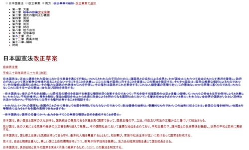 選挙が終わったところですが、Facebookでまわっていた、日本国憲法改正草案の表現が本当におもしろいと思います。Wordの変更履歴の記録のフォーマットに合わせた形で、憲法草案を見ることができます。まあ、Wordの変更履歴の形式を見たことがある人がどれく…