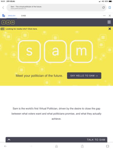 ニュージーランドにAI政治家がいる(ある?)と聞いて、検索してみました。AI政治家の名前はSAMと言います。 www.politiciansam.nz サイトにアクセスしてみると、「SAY HELLO TO SAM」というリンクがあるので、クリックしてみました。すると、チャット画面が…