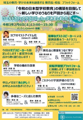 2021年2月6日に開催されます、埼玉の教育・学びの未来を創造する 教育長・校長 プラットフォームin戸田にゲストスピーカーとして参加させていただきます。 今回は、新たな取り組みとして、「反転型学習」を取り入れるそうです。8月に実施した前回のプラット…