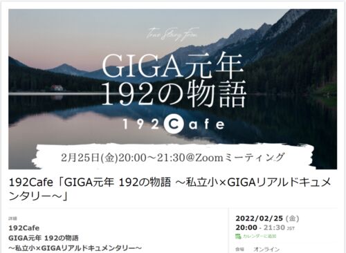2022年2月25日に、192Cafe「GIGA元年 192の物語 ~私立小×GIGAリアルドキュメンタリー~」をオンラインにて開催します。192Cafeは、私立小学校の先生方を中心としたコミュニティで、事務局としてお手伝いをさせていただいています。 https://192cafe-online7…