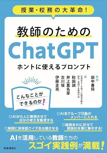 愛光中学校・高等学校の和田誠 先生から『教師のためのChatGPT ホントに使えるプロンプト』をお送りいただきました。たくさんのプロンプトが紹介されています。教師のためのChatGPT ホントに使えるプロンプト: 授業・校務の大革命!作者:和田誠,井上嘉名芽,古…
