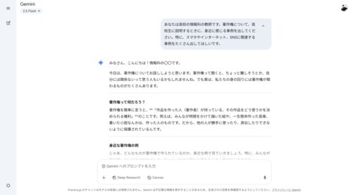 先日公開した、神奈川県立上鶴間高校の1年生の情報Ⅰの授業で「知的財産権・著作権」を扱っていたのですが、レポートを書きながら「高校生にとって身近なスマホやインターネットに関する事例をたくさん出せたらいいな」と思ってので、Geminiに質問してみまし…