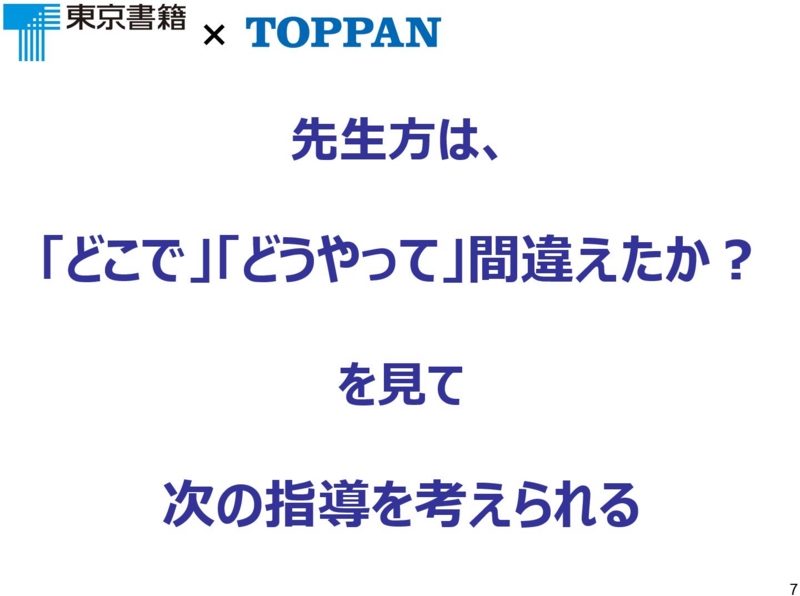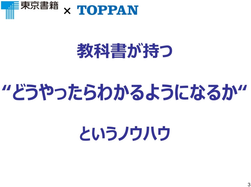 - 教科書という教育コンテンツを長い間作り続けてきた東京書籍と、教育コンテンツを教室に届けるシステムを開発している凸版印刷という、この2社が組むことで、「教科書づくりのノウハウを活かした新しいデジタル教材」を作ることができるのではないかと思っています。