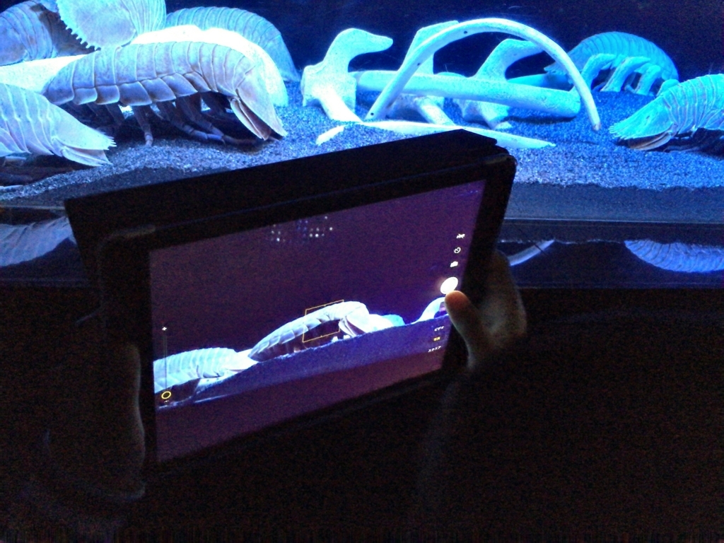 ここで、ダイオウグソクムシが飼育されているのですが、水槽の前で、小学校4年生の息子が自分のiPadを取り出して、撮影をしていました。画面も大きいし、あとで自分で見返すときも一人でできるし、操作がかんたんなのだと思います。