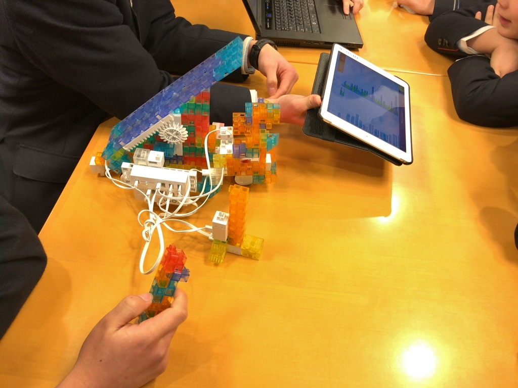 どんなふうに動くかをデモンストレーションしたあとで、最初の小さなブロックへと分解していました。テーブルの上はカラフルなKOOVのブロックでいっぱいになりました。