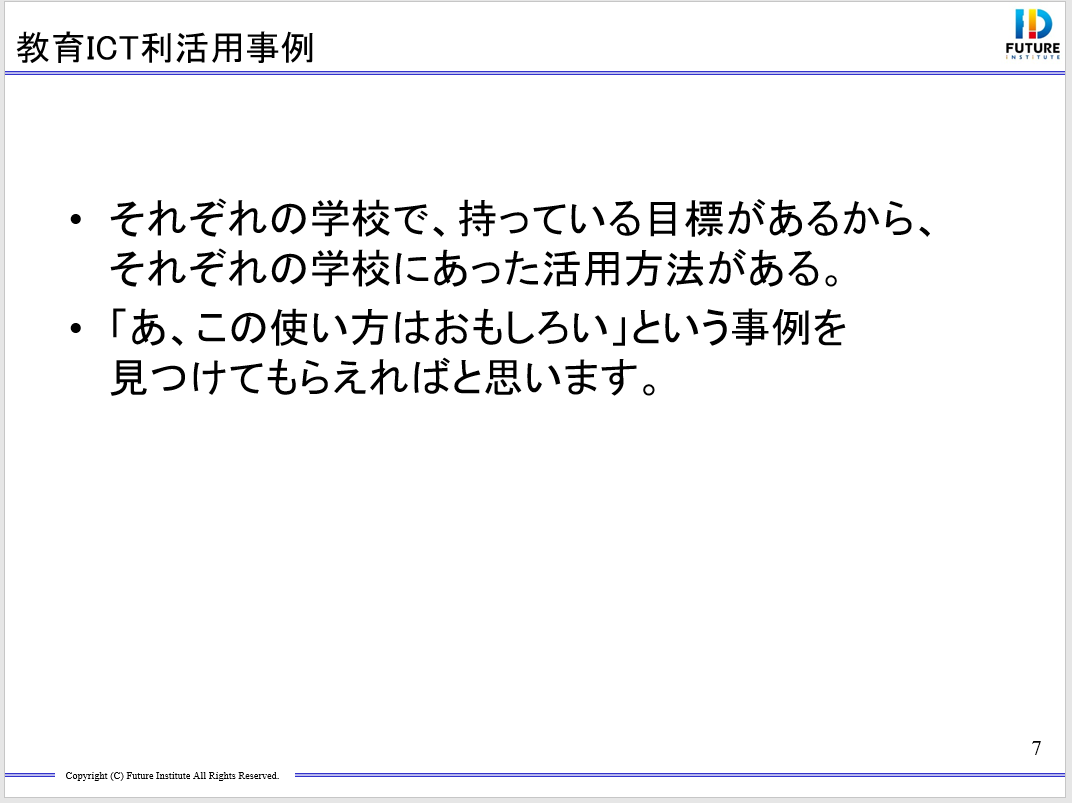 実践事例を紹介することで、参加する先生方が一人1台のタブレットを活用するアイデアを広げられるといいなと思っていました。