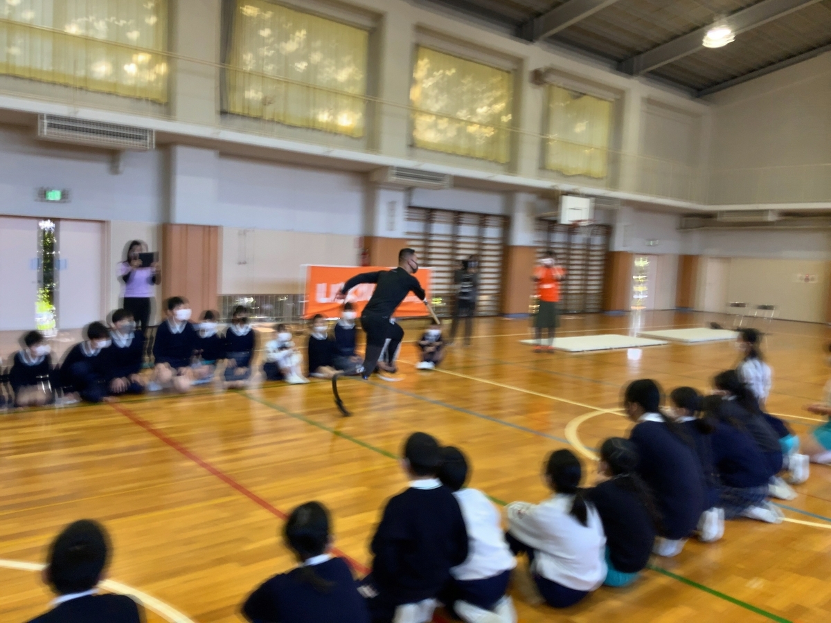 1時間目に5年菊組がスポーツ義足を体験した授業をレポートします。講師は、スポーツ義足で陸上競技をしている池田樹生 選手(デジタル・アドバタイジング・コンソーシアム株式会社所属)とユニバーサル・ラン講師の井上友綱さんが務めました。