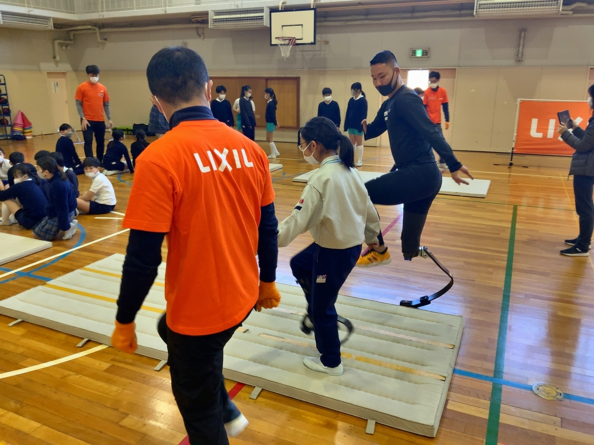 体育館で4ヶ所に分かれて、マットの上をスポーツ義足を着けて歩いてみます。ボランティアとして参加しているLIXILのスタッフの皆さんがサポートについてくれます。池田選手も子どもたちに声をかけていきます。
