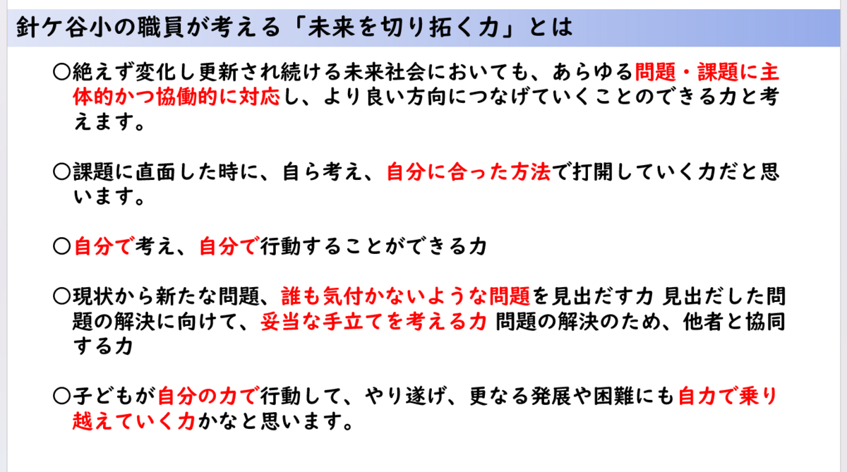 「未来を切り拓く力」とはどんなものだと考えているのかについては、針ケ谷小学校の研究主任である川畑那由昂 先生に登壇してもらって、話をしてもらいました。川畑先生は、この日のために先生方にアンケートを取ってくれていました。