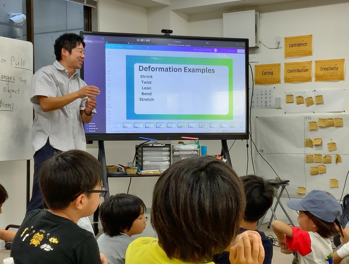 STEAMの時間は、担当シェルパのブシャンによって英語で進められていました。授業の最初は「Review time」で、「Push」「Pull」「Shrink」「Twist」「Lean」「Bend」「Stretch」など、この日のテーマである「Deformation(=形を変えること)」に関わる英語表現を子どもたちに紹介していきます。